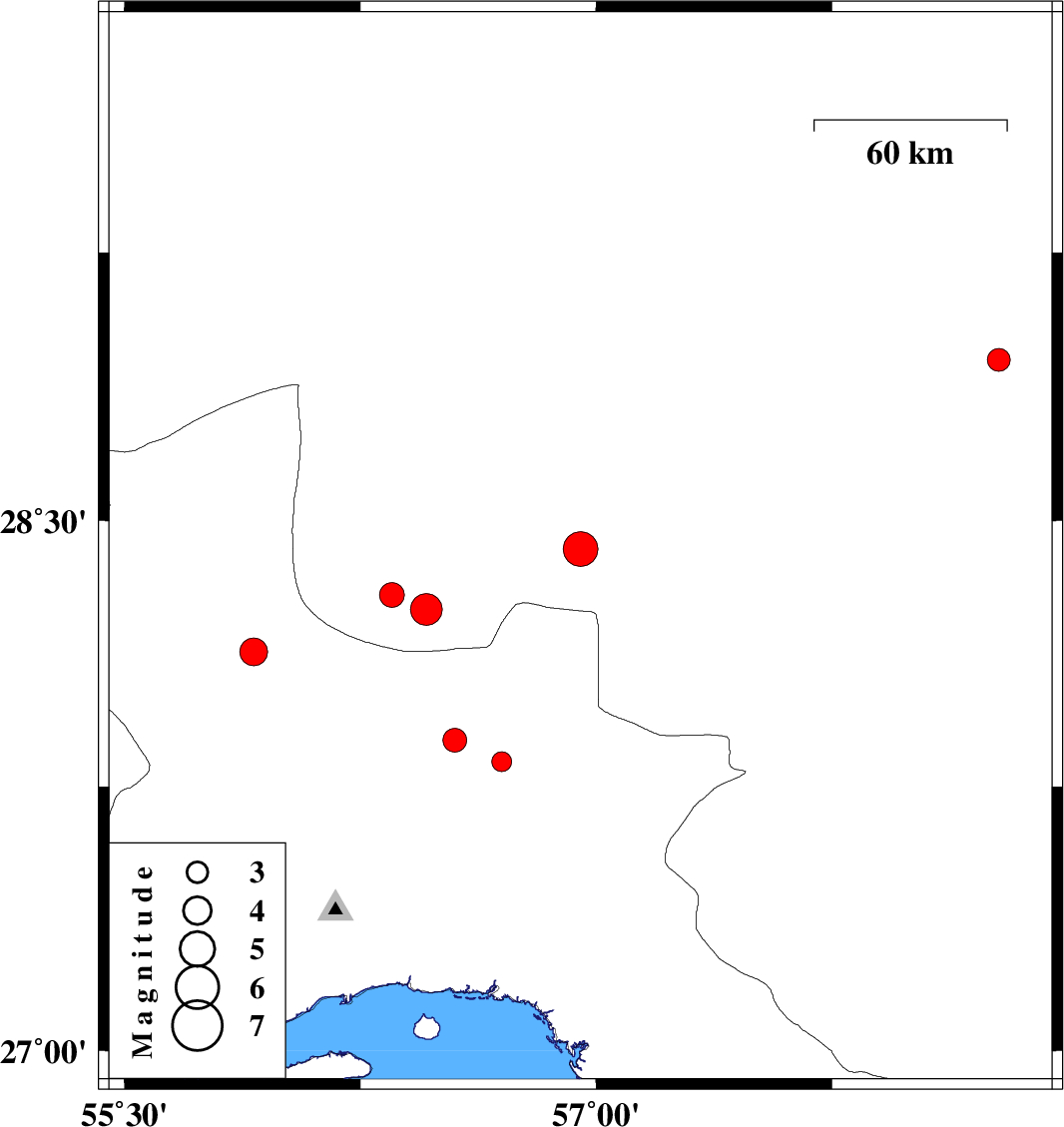 2011/02/22 | 22:21:59.0 | 01:51:59.0 | 27.82 | 56.7 | 15 | ML:2.8 | Hormozgan Province, 68 km North-West of Dehbarez | ||