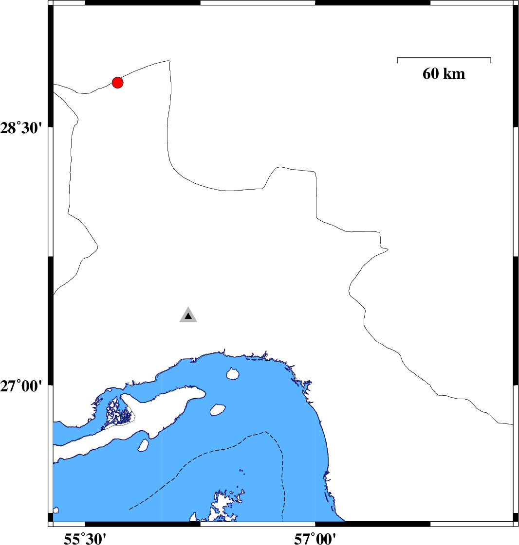 2011/02/22 | 22:21:59.0 | 01:51:59.0 | 27.82 | 56.7 | 15 | ML:2.8 | Hormozgan Province, 68 km North-West of Dehbarez | ||