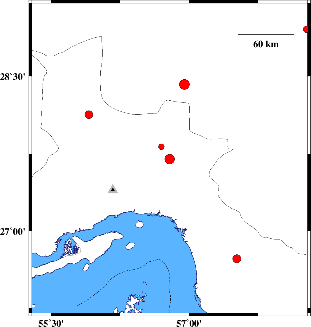 | 2011/02/22 | 22:21:59.0 | 01:51:59.0 | 27.82 | 56.7 | 15 | ML:2.8 | Hormozgan Province, 68 km North-West of Dehbarez | ||