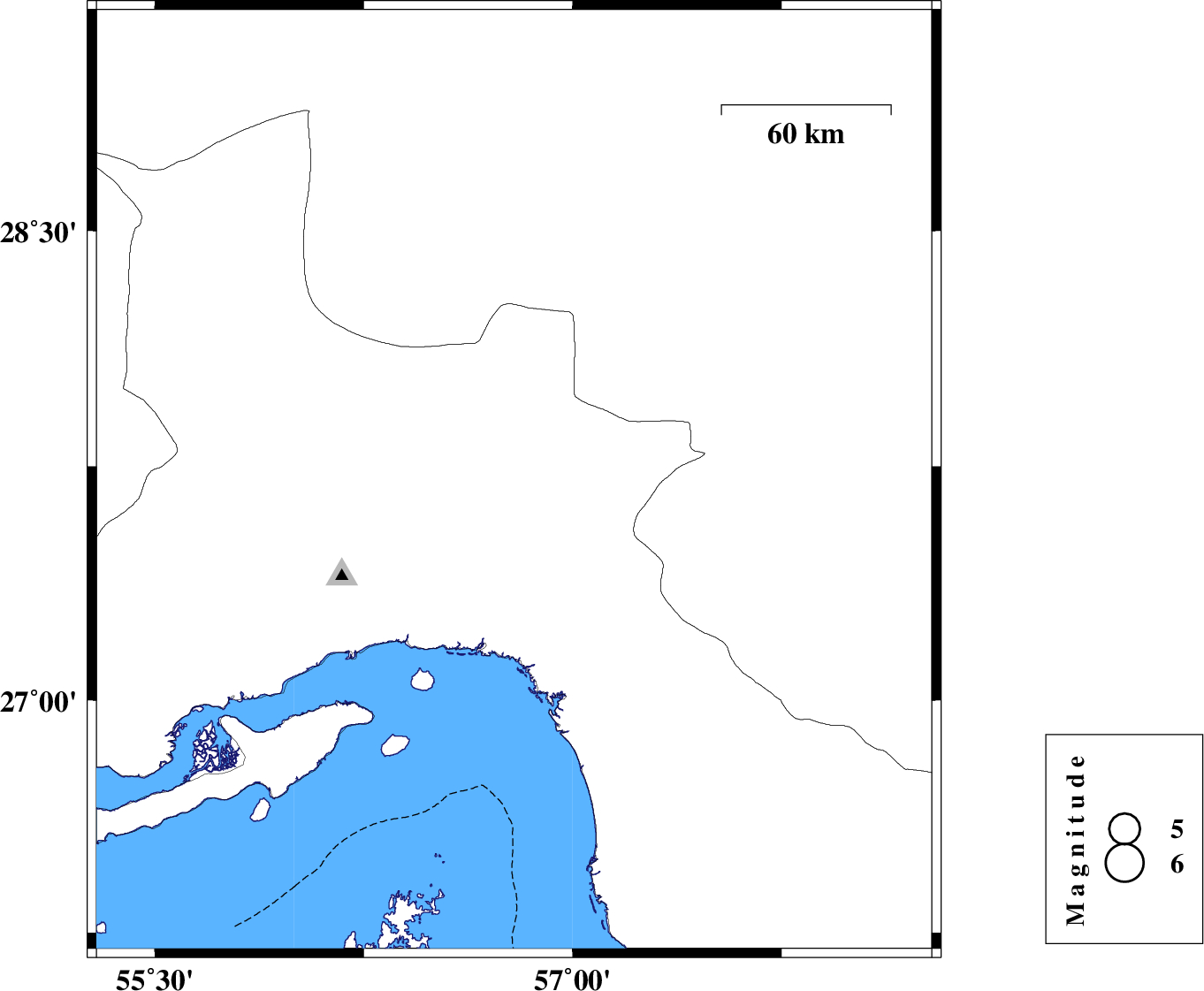 | 2011/03/14 | 07:55:09.8 | 11:25:09.8 | 27.7 | 56.79 | 25 | ML:4.8 | Hormozgan Province, 54 km North-West of Dehbarez |