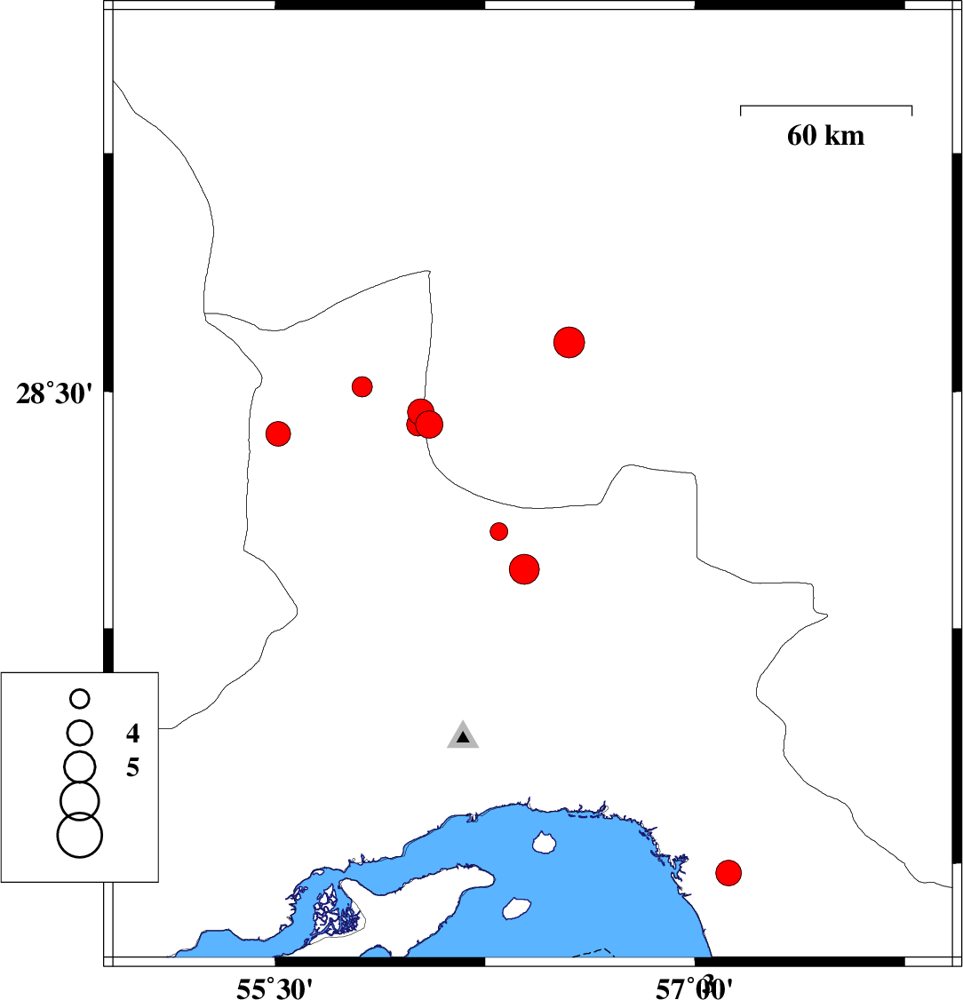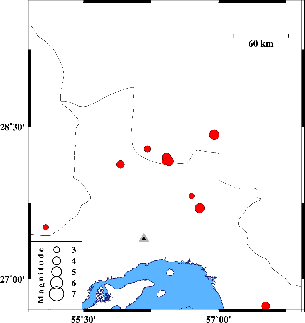 2011/03/14 07:55:09.8 11:25:09.8 27.756.7925 ML:4.8 Hormozgan Province, 54 km North-West of Dehbarez