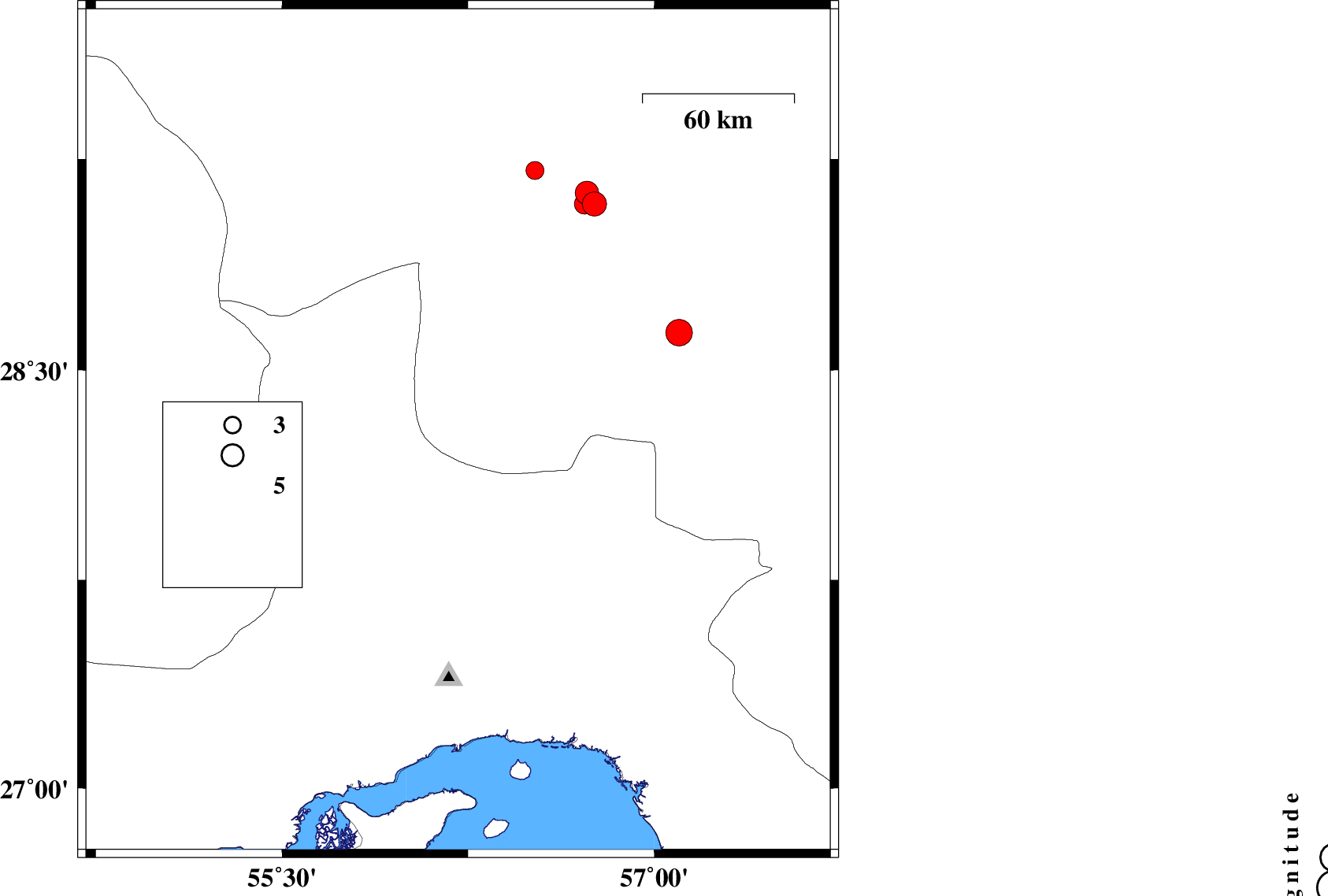 2011/03/14 07:55:09.8 11:25:09.8 27.756.7925 ML:4.8 Hormozgan Province, 54 km North-West of Dehbarez