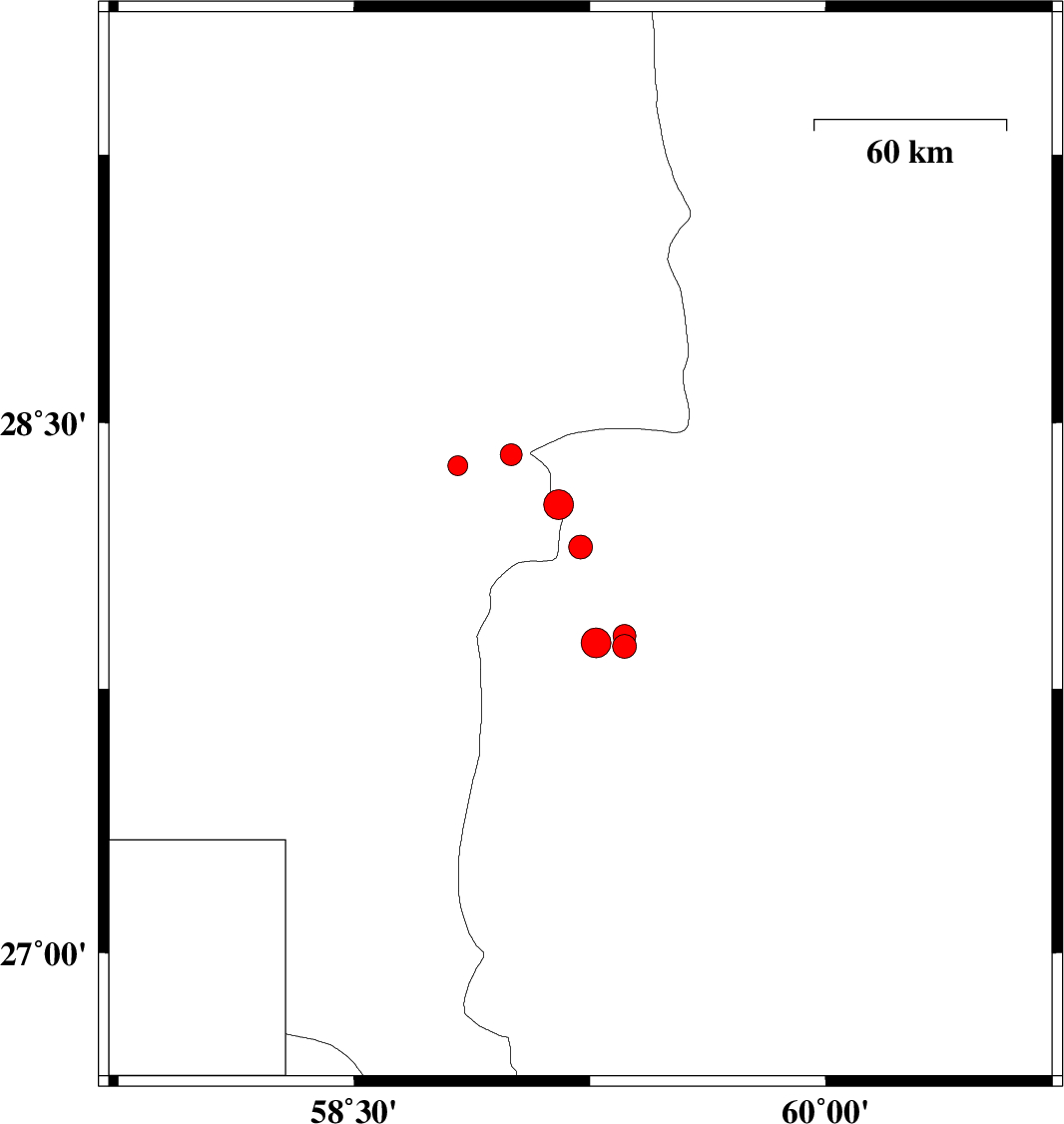 | 2011/03/21 | 06:02:22.5 | 09:32:22.5 | 27.88 | 59.27 | 18 | ML:4.2 | Sistan va Baloochestan Province, 155 km East of Kahnuj | ||