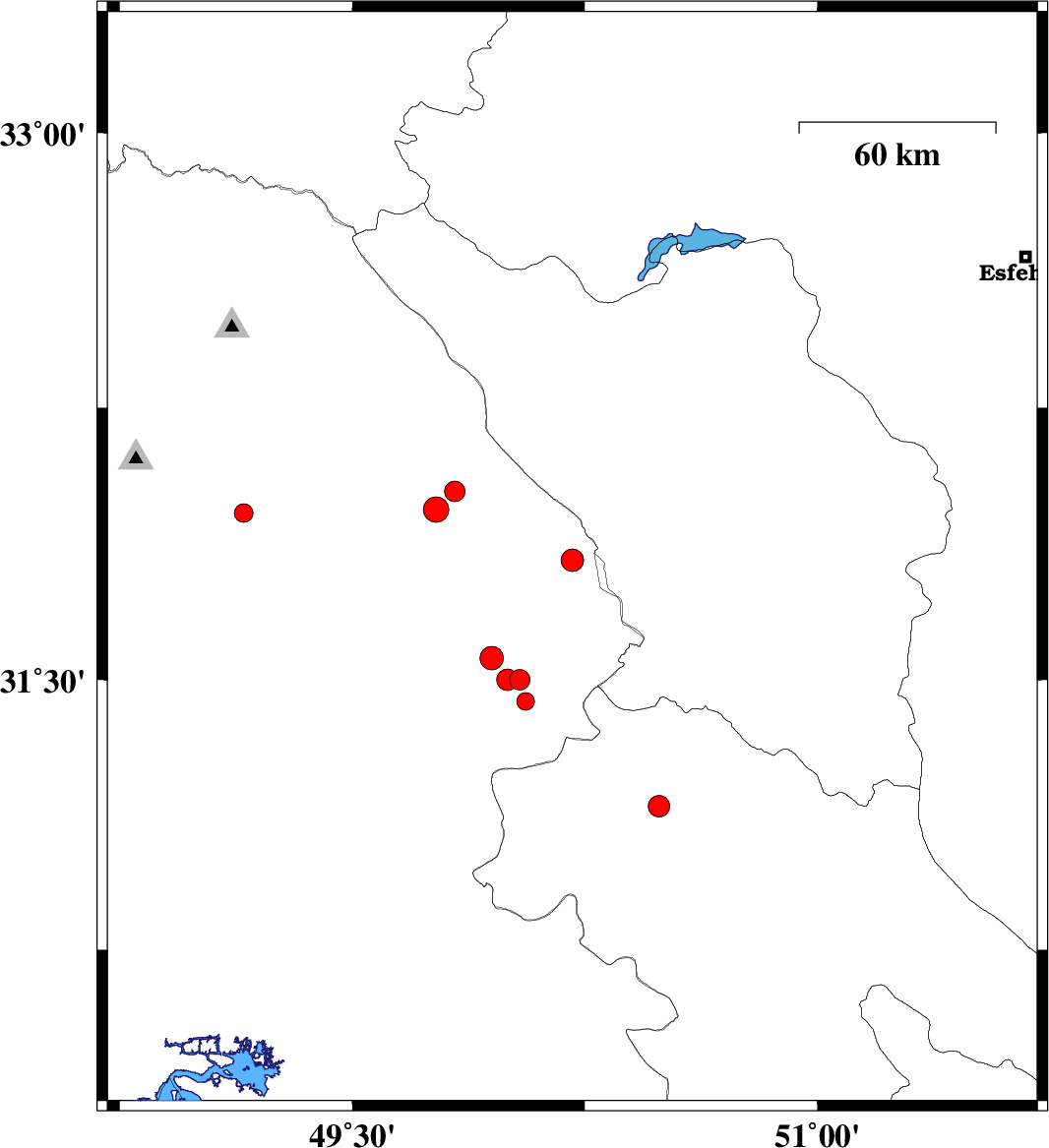 2011/03/18 | 05:26:20.9 | 08:56:20.9 | 31.5 | 50 | 33 | ML:3.1 | Khoozestan Province, 10 km East of Bagh Malek | ||