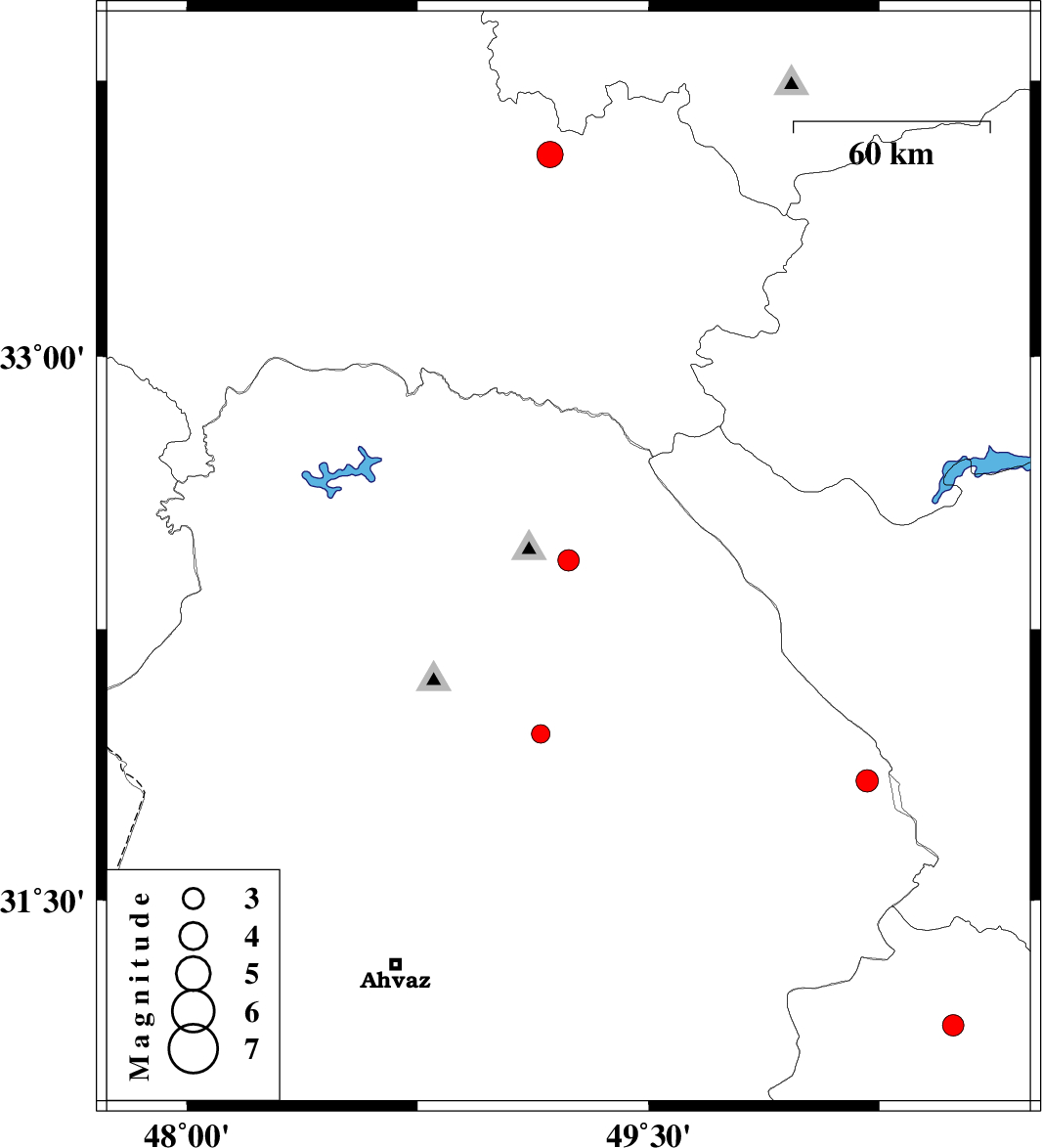 | 2011/03/28 | 18:22:54.0 | 22:52:54.0 | 32.44 | 49.24 | 14 | ML:3.1 | Khoozestan Province, 14 km East of Lali | ||