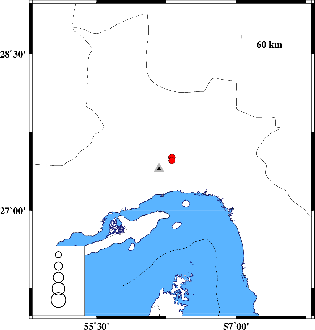 | 2011/03/30 | 23:07:30.2 | 03:37:30.2 | 27.48 | 56.31 | 14 | ML:3.1 | Hormozgan Province, 33 km North of Bandar-e abbas | ||