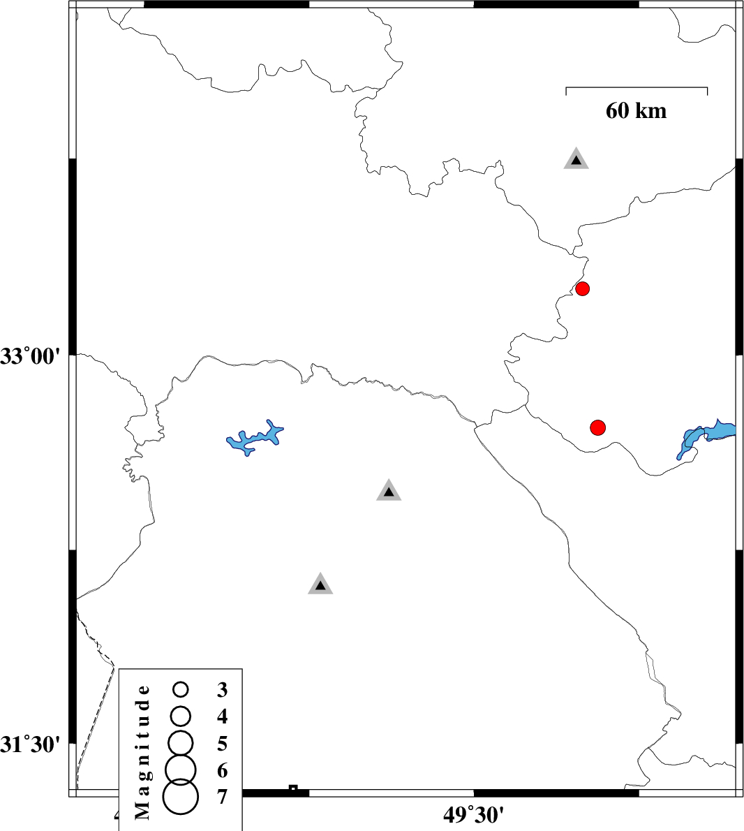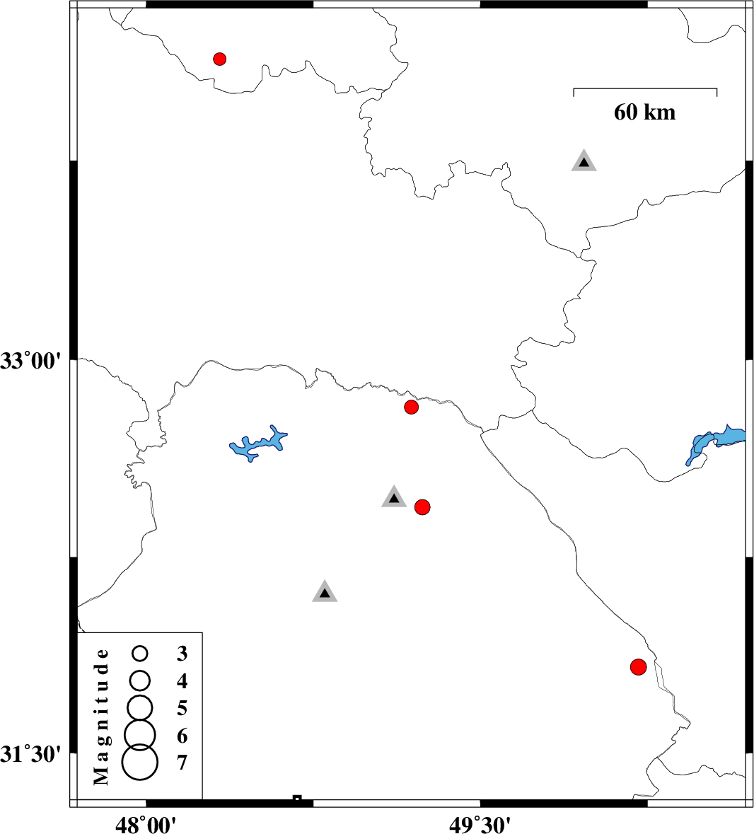 | 2011/03/28 | 18:22:54.0 | 22:52:54.0 | 32.44 | 49.24 | 14 | ML:3.1 | Khoozestan Province, 14 km East of Lali | ||