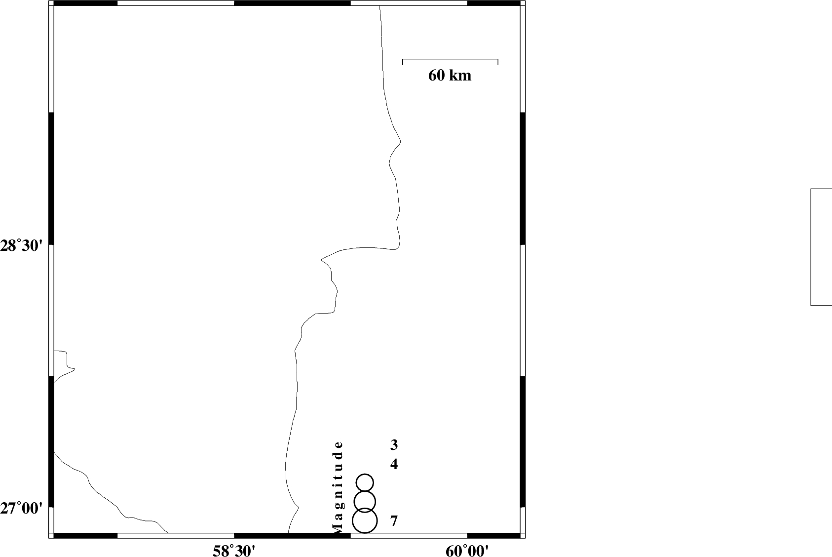 2011/04/04 | 09:17:31.7 | 13:47:31.7 | 28.35 | 58.84 | 15 | ML:3.3 | Kerman Province, 97 km South-East of Bam |