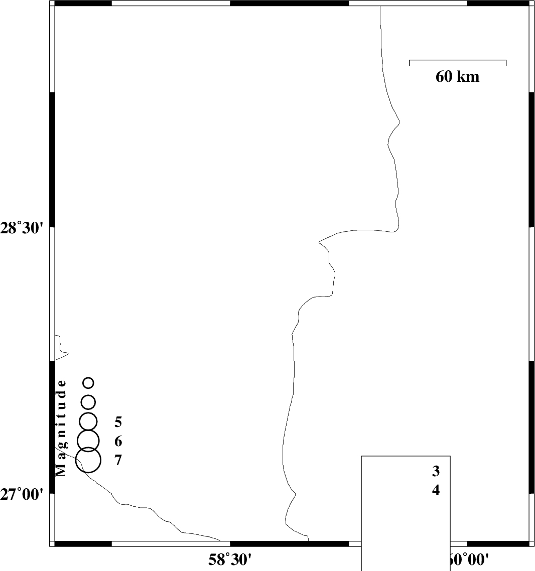 2011/04/04 | 09:17:31.7 | 13:47:31.7 | 28.35 | 58.84 | 15 | ML:3.3 | Kerman Province, 97 km South-East of Bam |