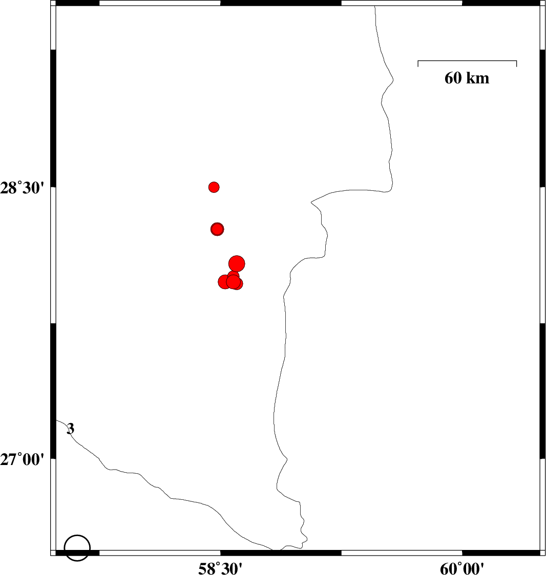 | 2011/04/09 | 19:55:57.6 | 00:25:57.6 | 28.41 | 58.84 | 14 | ML:2.9 | Kerman Province, 92 km South-East of Bam |
