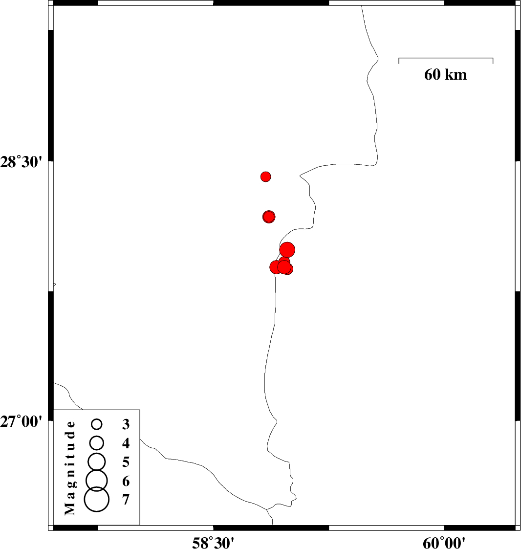 2011/04/11 | 12:02:15.3 | 16:32:15.3 | 27.89 | 58.91 | 15 | ML:4 | Sistan va Baloochestan Province, 120 km East of Kahnuj | ||