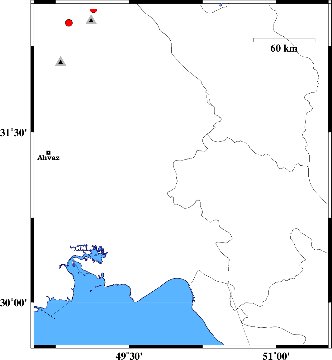 | 2011/04/19 | 15:43:13.6 | 20:13:13.6 | 31.63 | 49.56 | 14 | ML:3.7 | Khoozestan Province, 39 km North of Ramhormoz | ||