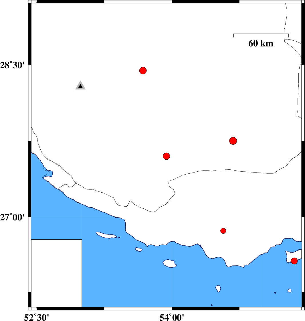2011/05/03 | 21:20:16.2 | 01:50:16.2 | 27.6 | 53.94 | 15 | ML:3.4 | Fars Province, 41 km West of Lar | ||