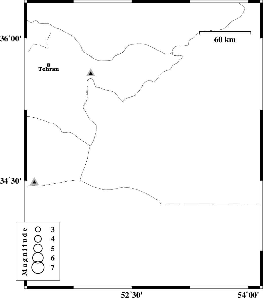 2011/05/08 | 04:02:58.5 | 08:32:58.5 | 34.87 | 52.65 | 15 | ML:3.2 | Semnan Province, 49 km South-East of Garmsar | ||