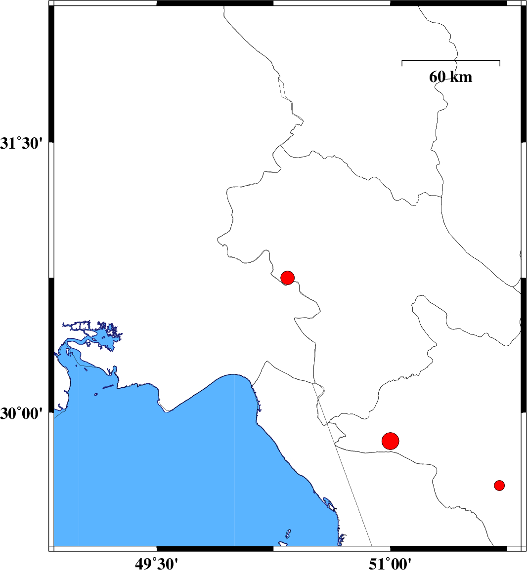 2011/05/08 | 10:53:21.2 | 15:23:21.2 | 30.75 | 50.34 | 14 | ML:3.9 | Kohkiluieh va boyerahmad Province, 19 km North of Behbahan | ||