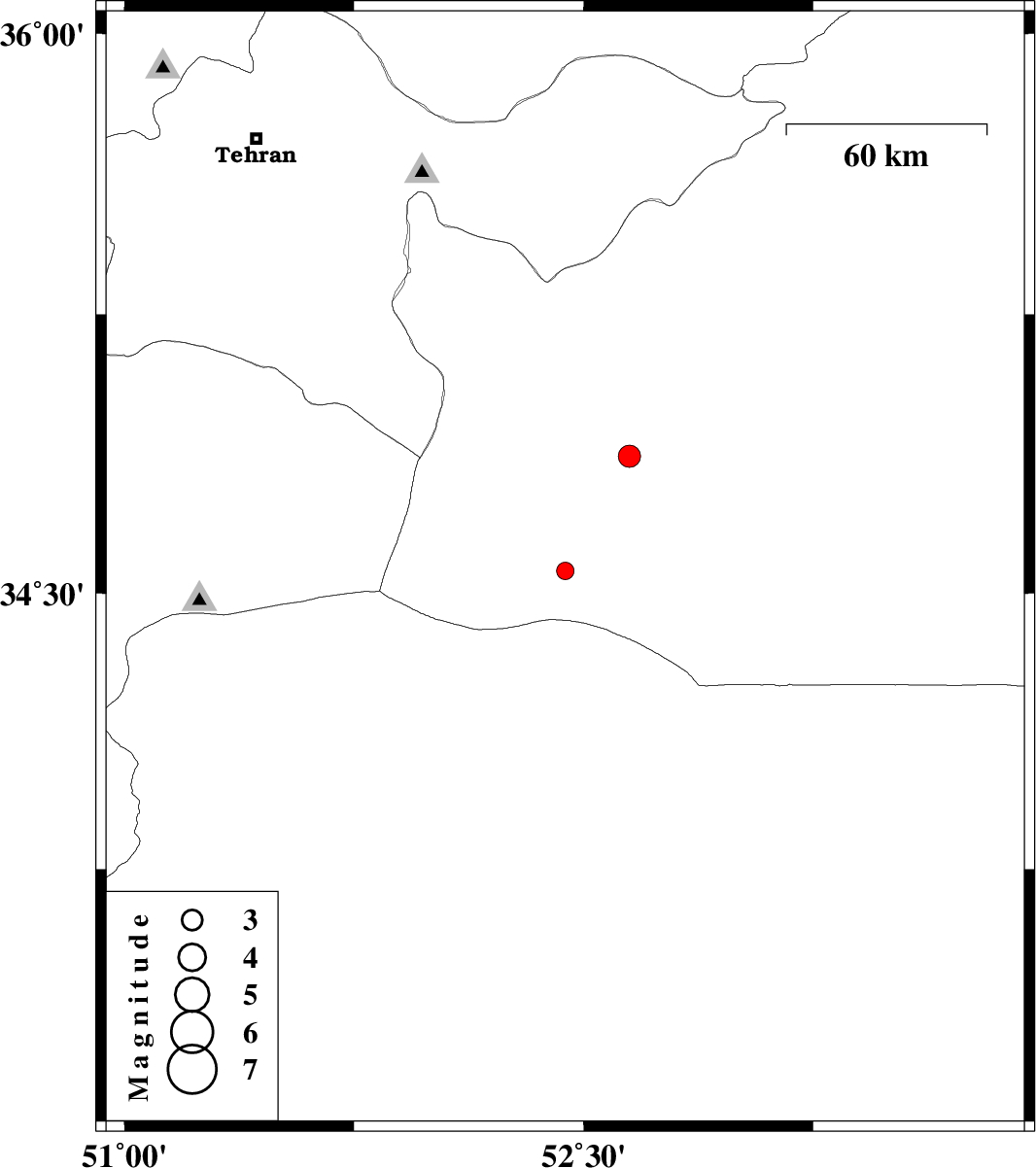 2011/05/08 | 04:02:58.5 | 08:32:58.5 | 34.87 | 52.65 | 15 | ML:3.2 | Semnan Province, 49 km South-East of Garmsar |