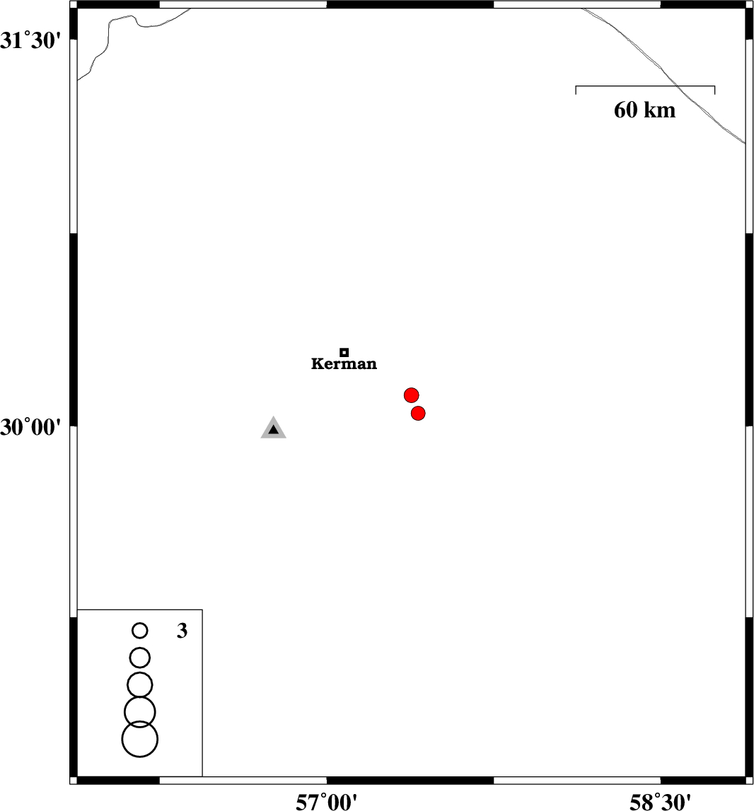 | 2011/05/11 | 20:14:48.5 | 00:44:48.5 | 30.12 | 57.38 | 6 | ML:3 | Kerman Province, 35 km South-East of Kerman |