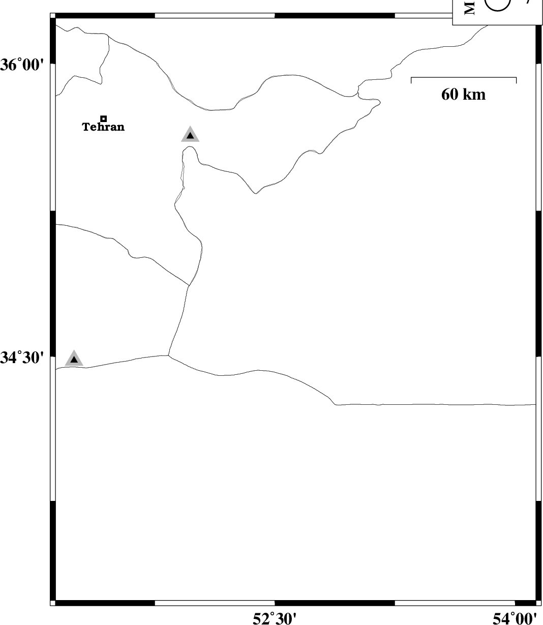 2011/05/08 | 04:02:58.5 | 08:32:58.5 | 34.87 | 52.65 | 15 | ML:3.2 | Semnan Province, 49 km South-East of Garmsar | ||
