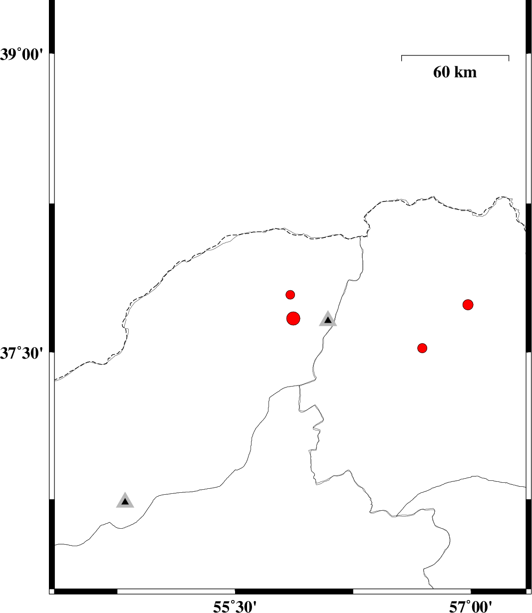 2011/05/27 | 20:15:24.3 | 00:45:24.3 | 37.79 | 55.85 | 20 | ML:2.5 | Golestan Province, 55 km North-East of Kalaleh | ||