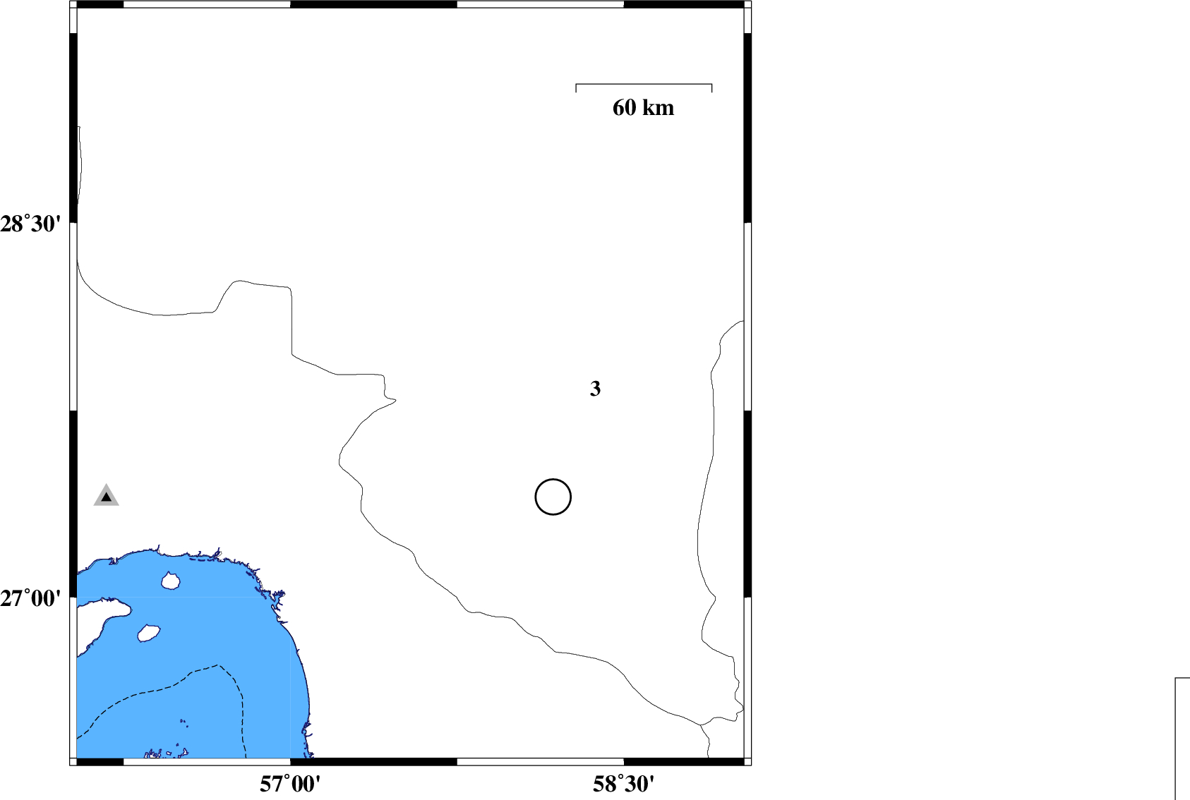 2011/05/24 | 16:16:24.0 | 20:46:24.0 | 28.39 | 59.01 | 14 | ML:3.2 | Kerman Province, 102 km South-East of Bam |
