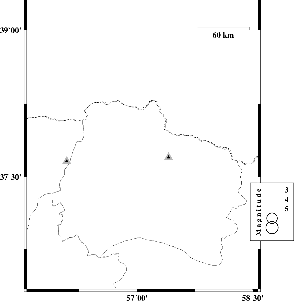 2011/06/04 | 21:45:54.2 | 02:15:54.2 | 37.83 | 57.07 | 42 | ML:3 | Khorasan(north) Province, 33 km North-East of Ashkhaneh | ||