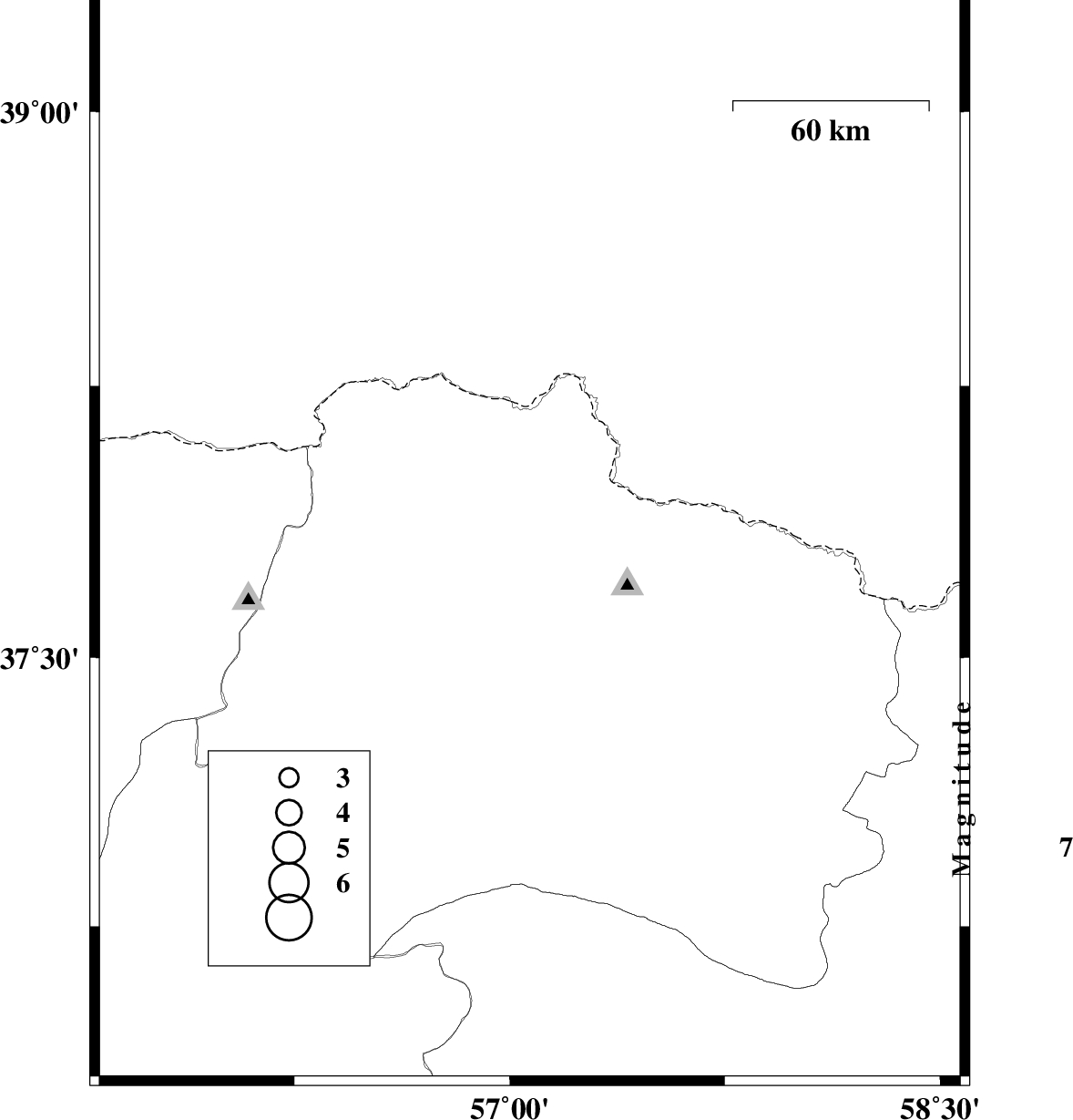 2011/06/04 | 21:45:54.2 | 02:15:54.2 | 37.83 | 57.07 | 42 | ML:3 | Khorasan(north) Province, 33 km North-East of Ashkhaneh |