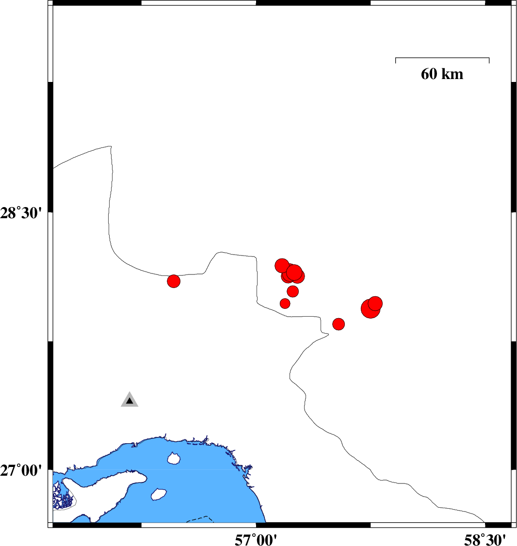 2011/06/15 05:09:00.9 09:39:00.9 27.9757.1945 ML:3 Kerman Province, 49 km West of Kahnuj