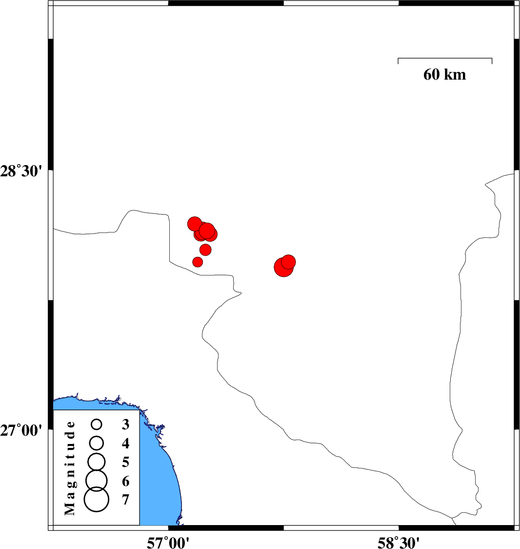 2011/06/15 05:09:00.9 09:39:00.9 27.9757.1945 ML:3 Kerman Province, 49 km West of Kahnuj