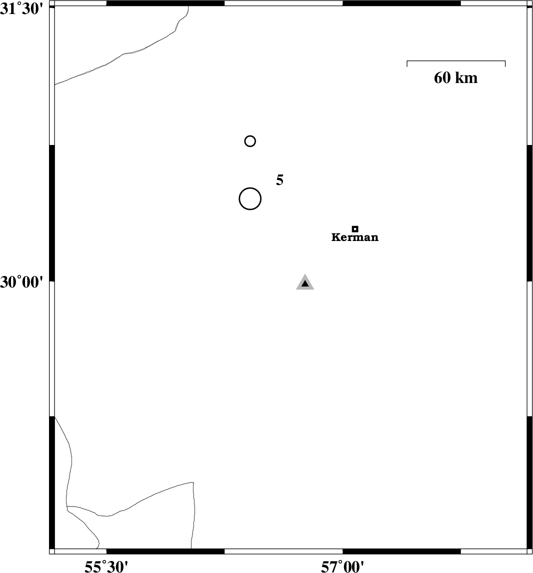 | 2011/07/09 | 01:11:40.4 | 05:41:40.4 | 31.26 | 56.47 | 18 | ML:2.8 | Kerman Province, 32 km West of Ravar |