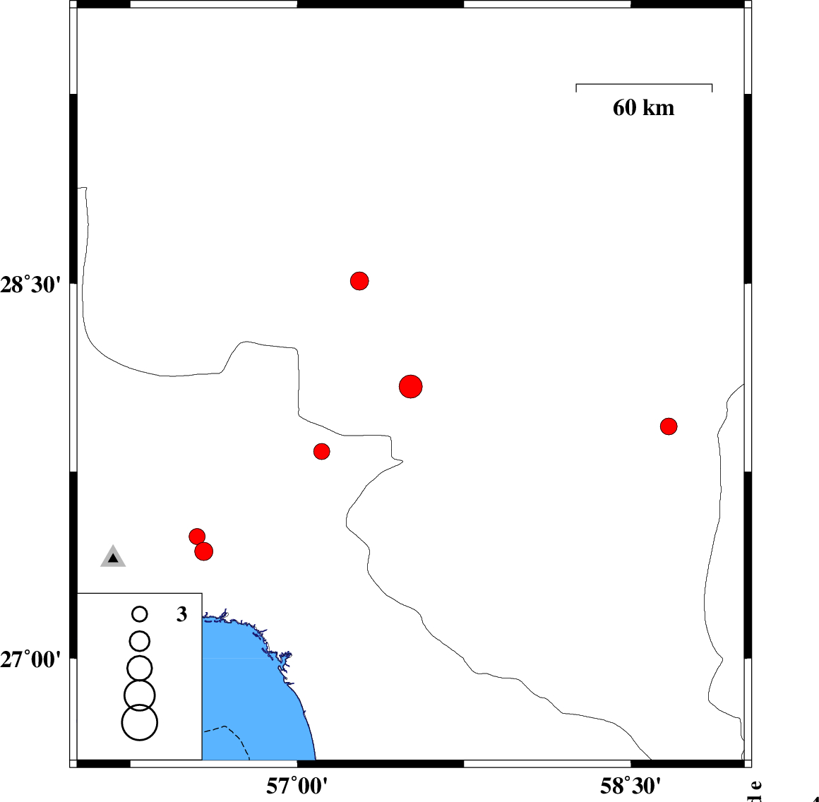 2011/07/04 | 07:46:27.2 | 12:16:27.2 | 27.93 | 58.67 | 14 | ML:3.4 | Kerman Province, 96 km East of Kahnuj |