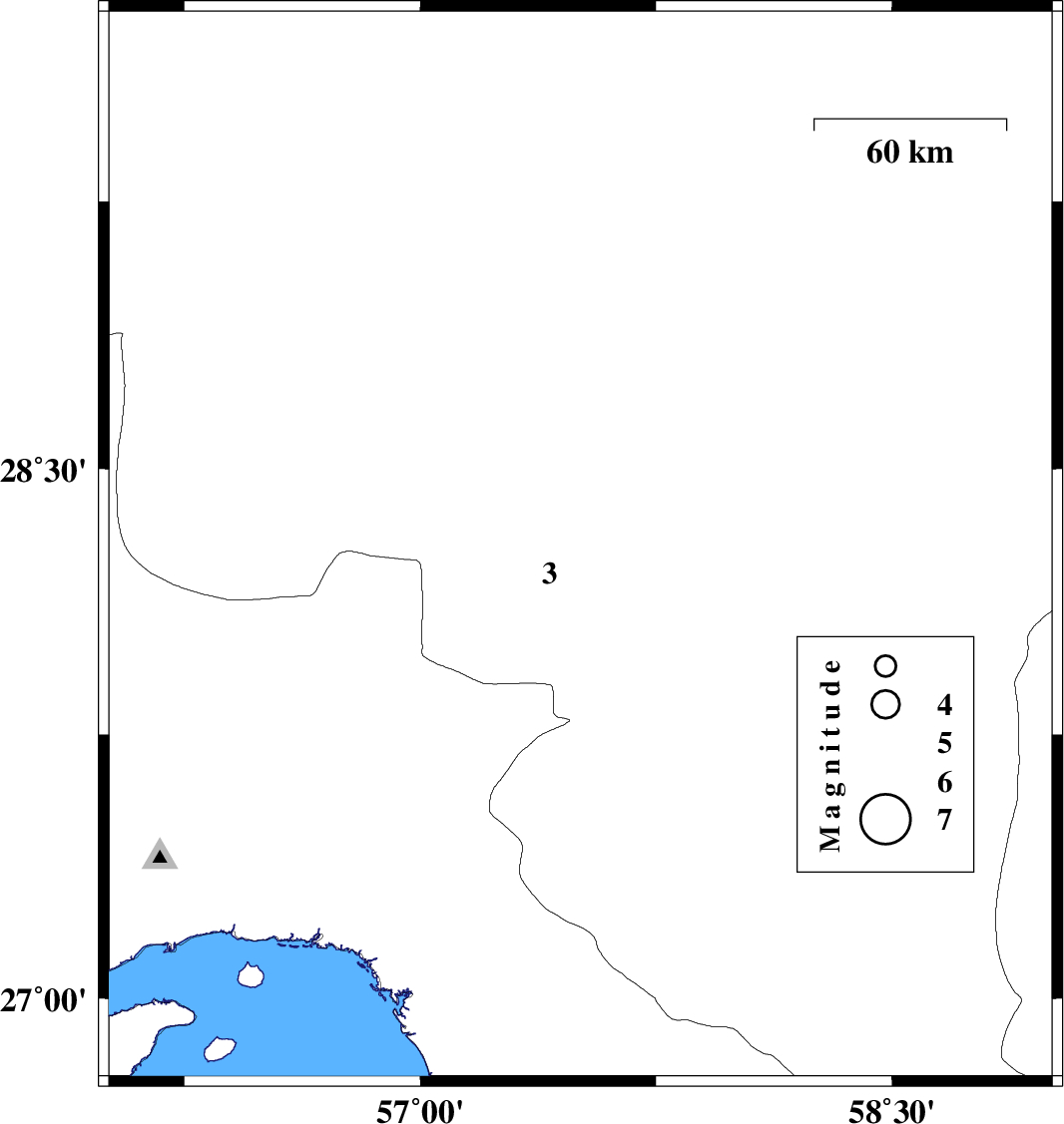 2011/07/28 | 22:27:11.9 | 02:57:11.9 | 28.09 | 57.51 | 44 | ML:4.6 | Kerman Province, 23 km North-West of Kahnuj | ||