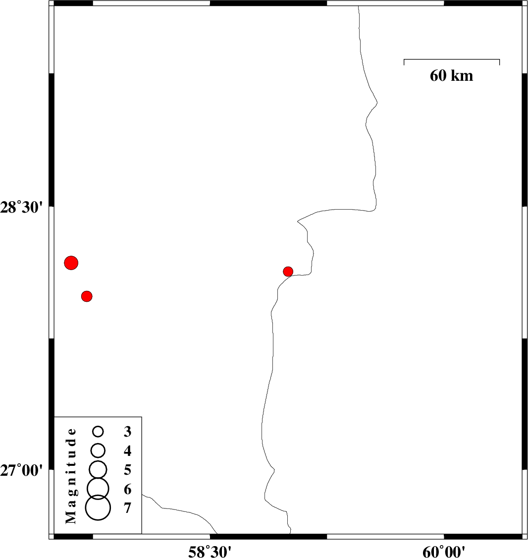 | 2011/08/07 | 15:03:37.9 | 19:33:37.9 | 27.99 | 57.71 | 14 | ML:3.1 | Kerman Province, 4 km Kahnuj |