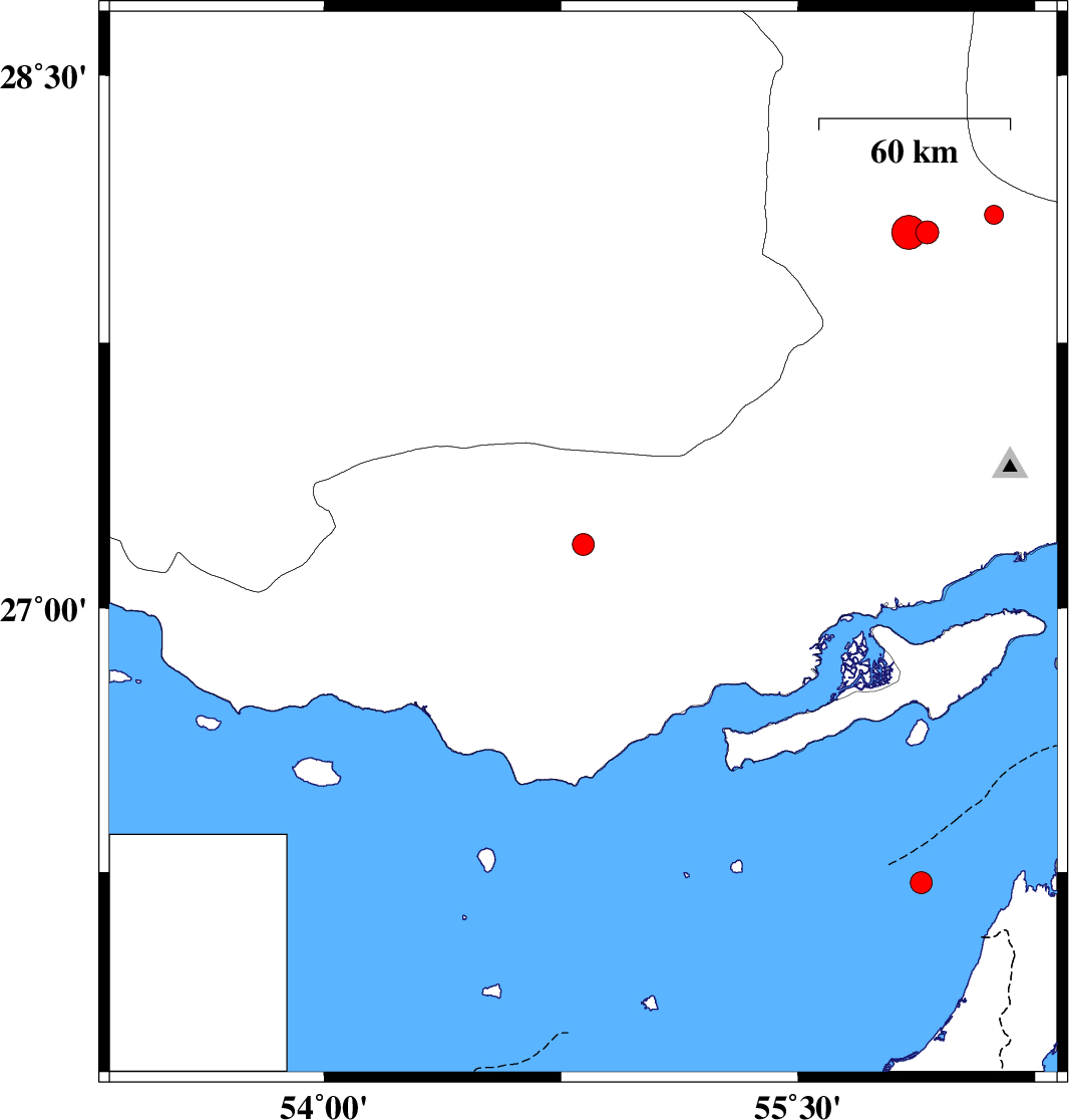 2011/08/20 | 22:40:29.1 | 03:10:29.1 | 26.22 | 55.89 | 33 | ML:3.1 | Persian Gulf, 90 km South-West of Qeshm | ||