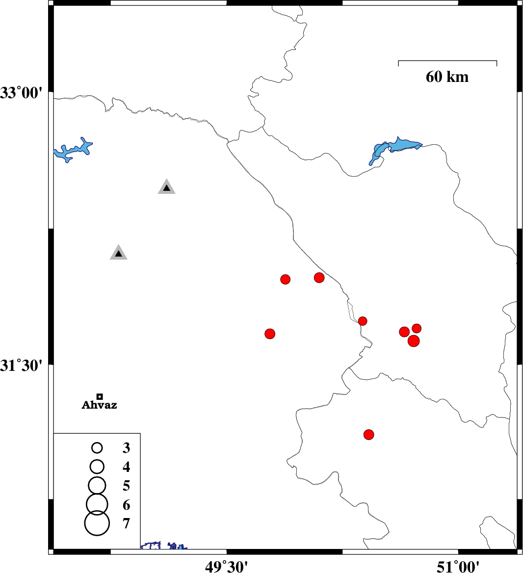 | 2011/09/07 | 09:34:46.2 | 14:04:46.2 | 31.97 | 49.88 | 32 | ML:2.8 | Khoozestan Province, 15 km North of Izeh | ||