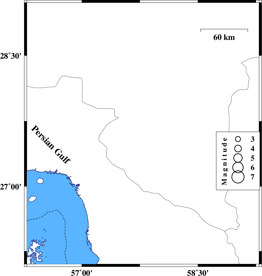 | 2011/09/13 | 05:05:08.6 | 09:35:08.6 | 27.6 | 57.79 | 40 | ML:3.5 | Kerman Province, 41 km South of Kahnuj | ||