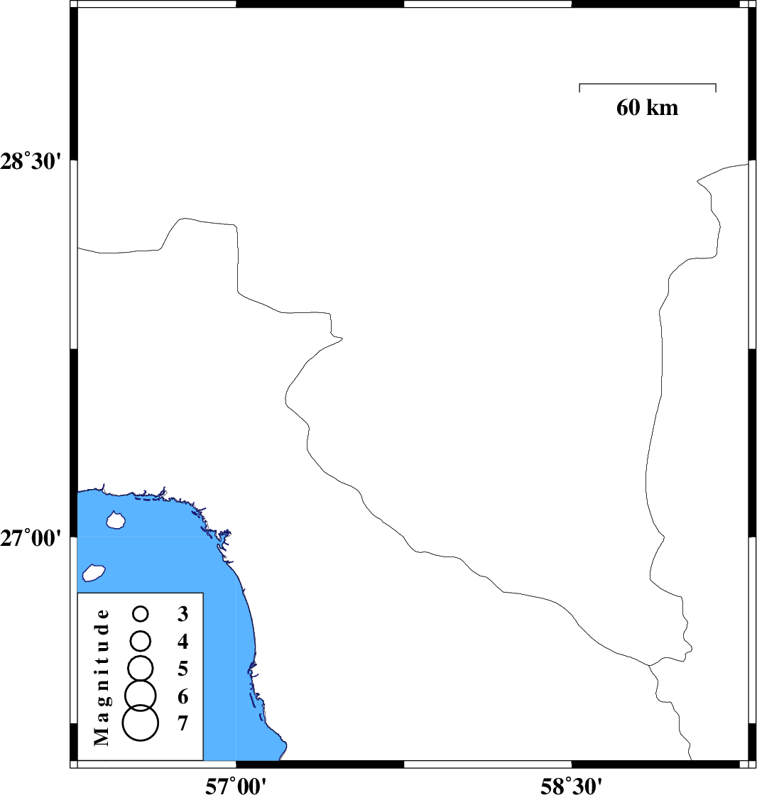| 2011/09/13 | 05:05:08.6 | 09:35:08.6 | 27.6 | 57.79 | 40 | ML:3.5 | Kerman Province, 41 km South of Kahnuj |