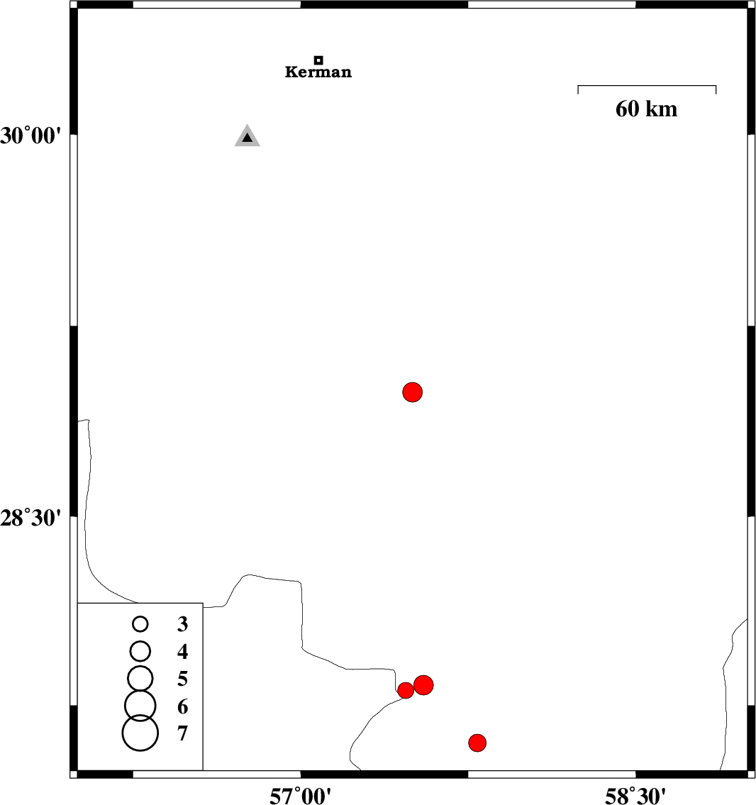 2011/09/13 | 05:05:08.6 | 09:35:08.6 | 27.6 | 57.79 | 40 | ML:3.5 | Kerman Province, 41 km South of Kahnuj | ||