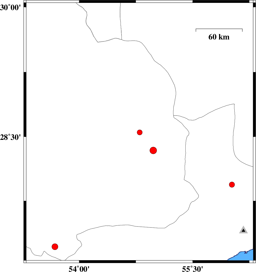 | 2011/09/20 | 20:23:42.3 | 00:53:42.3 | 27.21 | 53.68 | 29 | ML:3.6 | Fars Province, 53 km South-East of Lamerd | ||