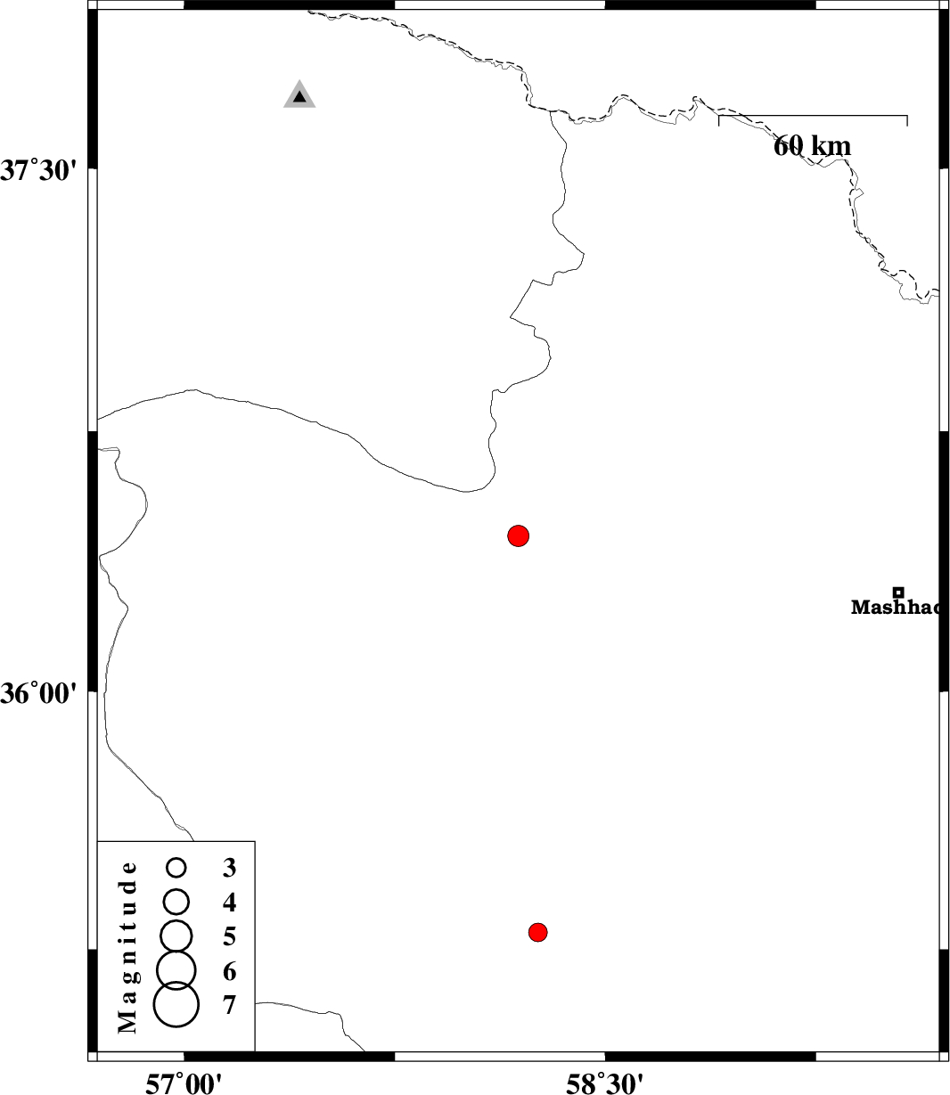 | 2011/10/11 | 07:36:40.5 | 11:06:40.5 | 35.3 | 58.26 | 15 | ML:3 | Khorasan(center) Province, 20 km West of Kashmar |