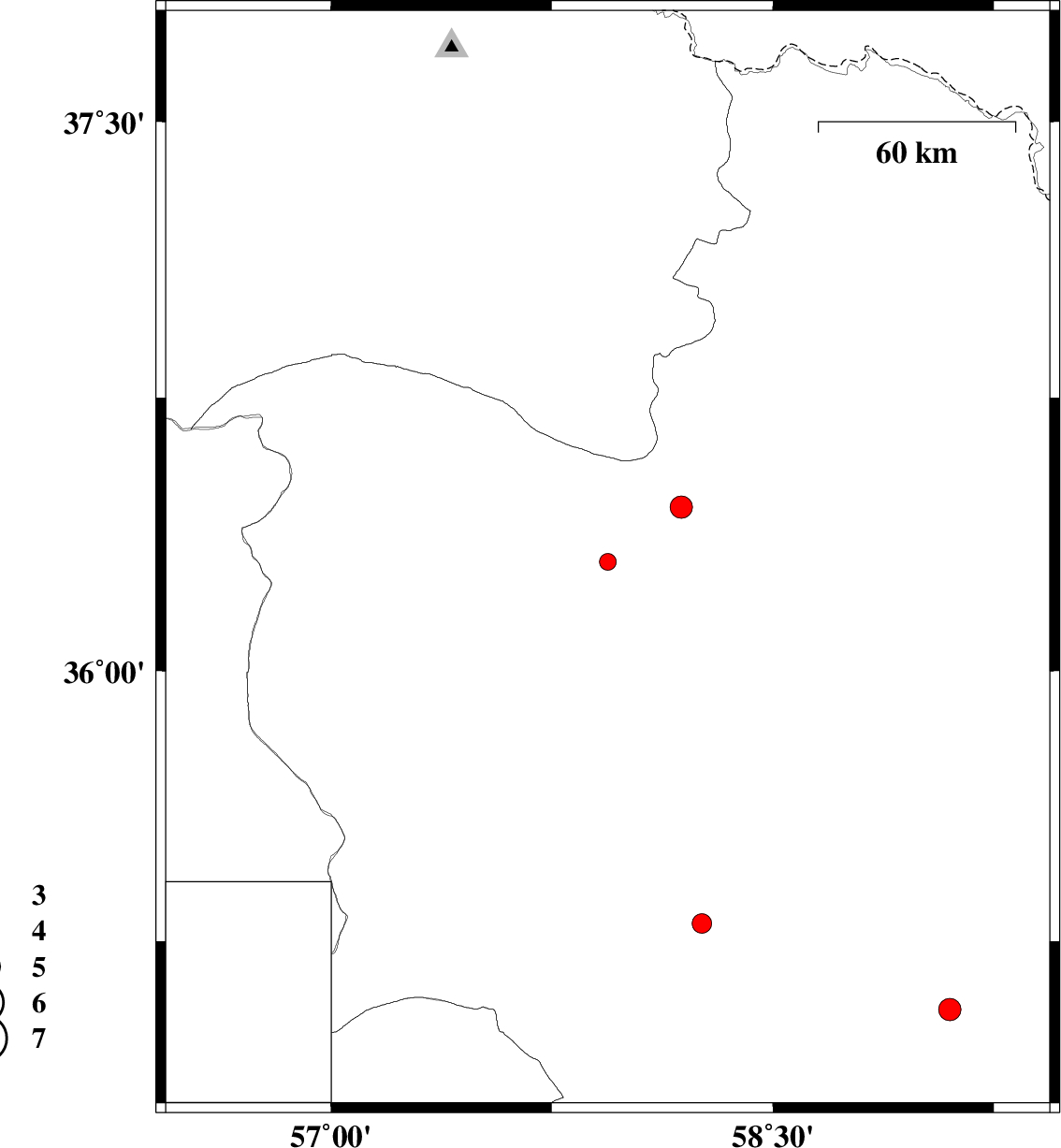 2011/10/23 | 07:11:29.6 | 10:41:29.6 | 36.3 | 57.94 | 15 | ML:2.6 | Khorasan(center) Province, 26 km East of Sabzevar | ||