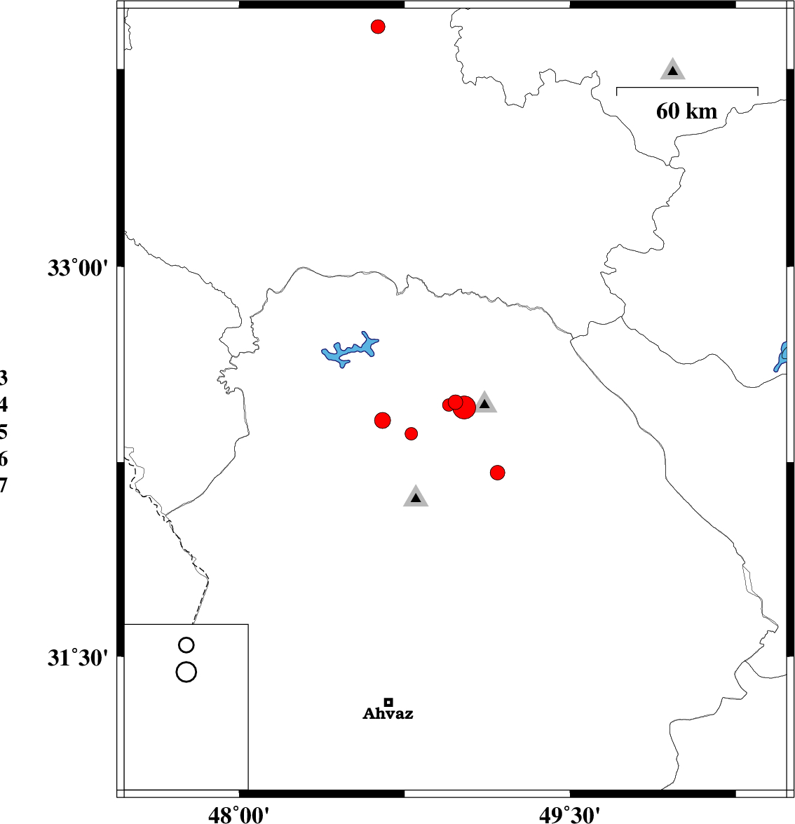 | 2011/10/30 | 01:12:06.8 | 04:42:06.8 | 32.48 | 48.98 | 15 | ML:2.9 | Khoozestan Province, 16 km West of Lali | ||