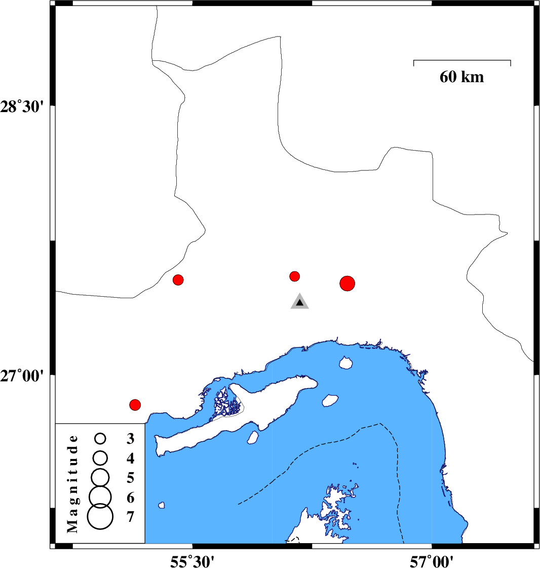 2011/11/05 | 07:45:44.5 | 11:15:44.5 | 26.83 | 55.14 | 40 | ML:3.1 | Hormozgan Province, 44 km North-East of Bandar-e lengeh | ||