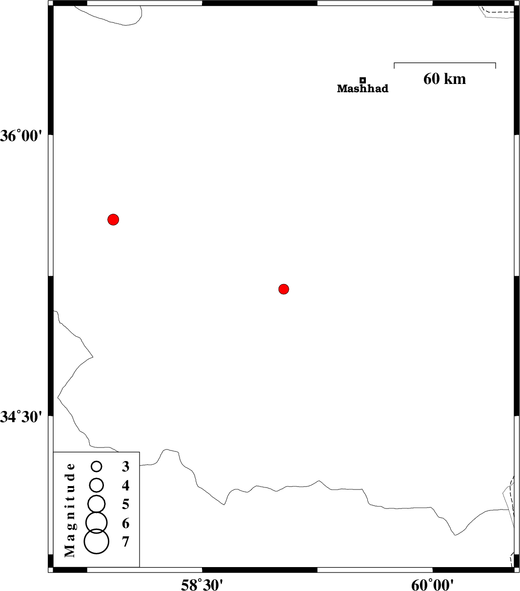 | 2011/11/14 | 06:54:37.0 | 10:24:37.0 | 35.55 | 57.92 | 43 | ML:3.3 | Khorasan(center) Province, 32 km North of Bardeskan |