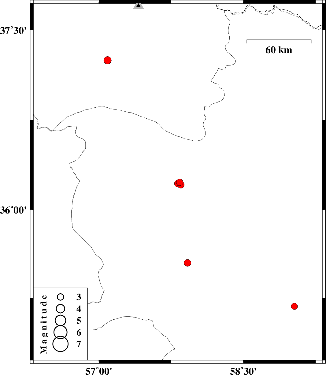 | 2011/11/14 | 06:54:37.0 | 10:24:37.0 | 35.55 | 57.92 | 43 | ML:3.3 | Khorasan(center) Province, 32 km North of Bardeskan | ||