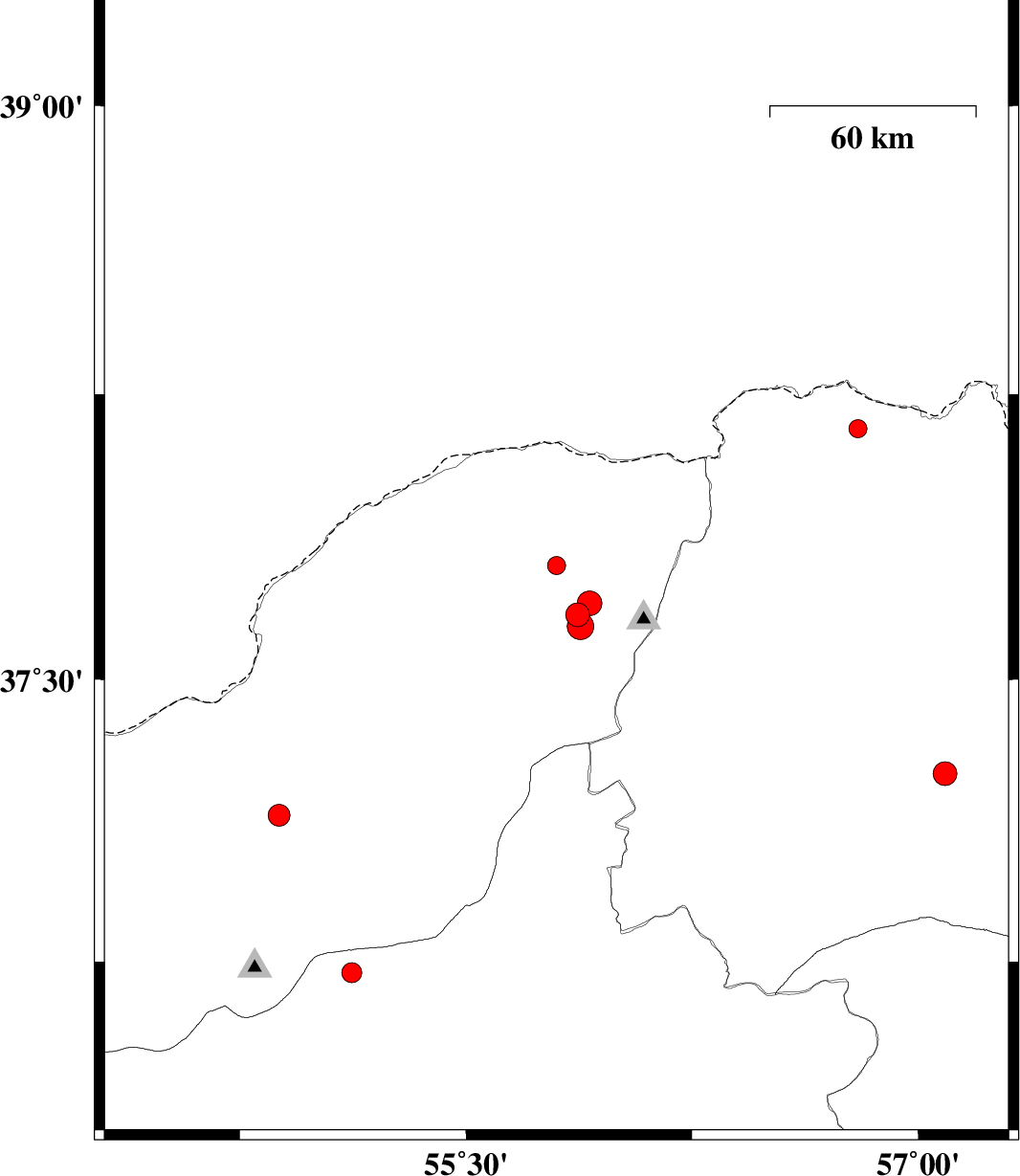 | 2011/12/01 | 03:56:42.1 | 07:26:42.1 | 37.8 | 55.8 | 6 | ML:2.7 | Golestan Province, 54 km North-East of Kalaleh | ||