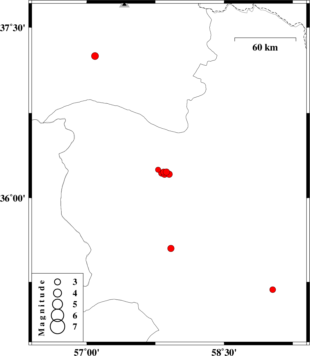 | 2011/11/14 | 06:54:37.0 | 10:24:37.0 | 35.55 | 57.92 | 43 | ML:3.3 | Khorasan(center) Province, 32 km North of Bardeskan | ||