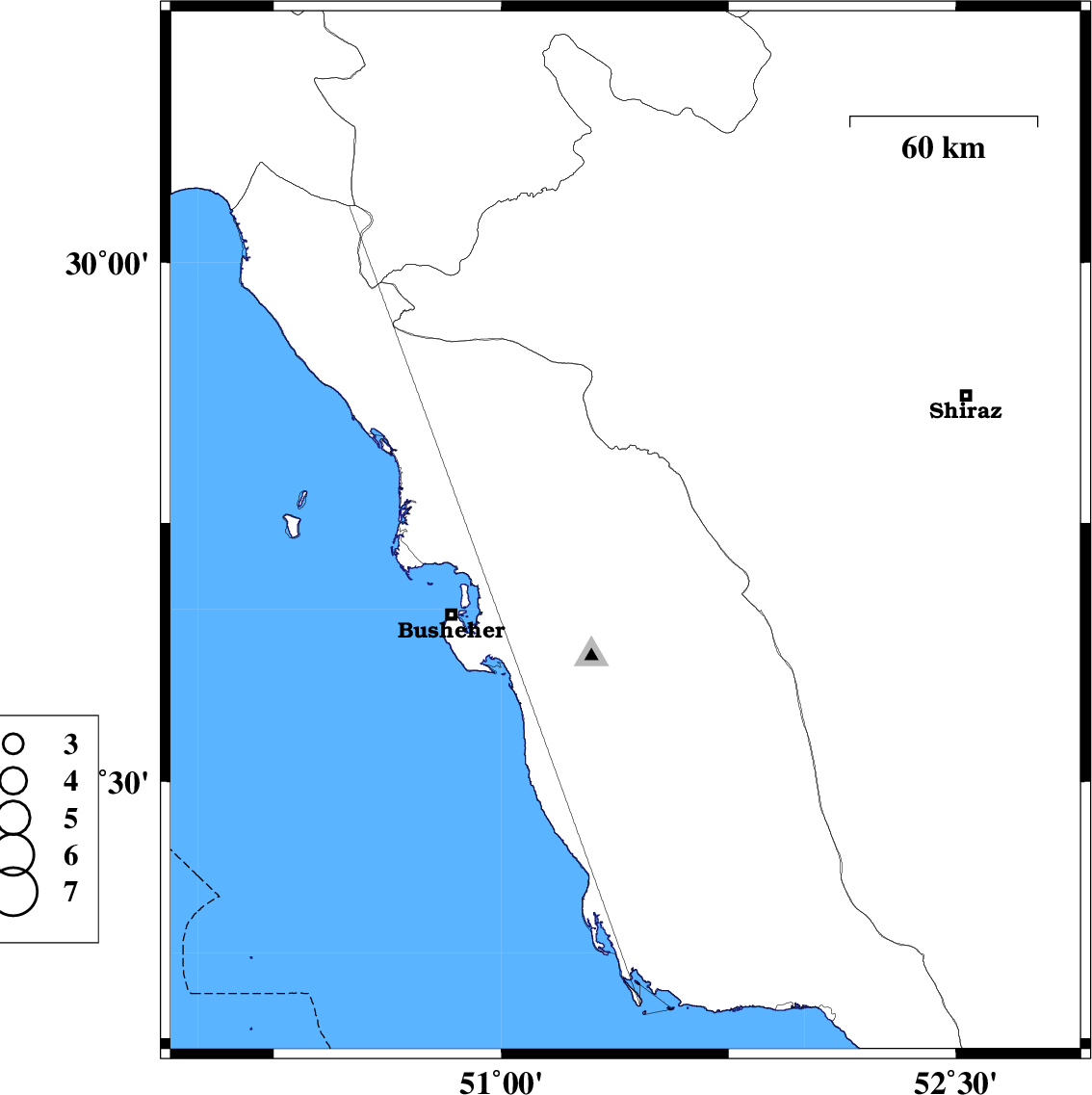 | 2011/12/05 | 06:12:45.0 | 09:42:45.0 | 29.22 | 51.41 | 3 | ML:3.5 | Bushehr Province, 20 km East of Borazjan |