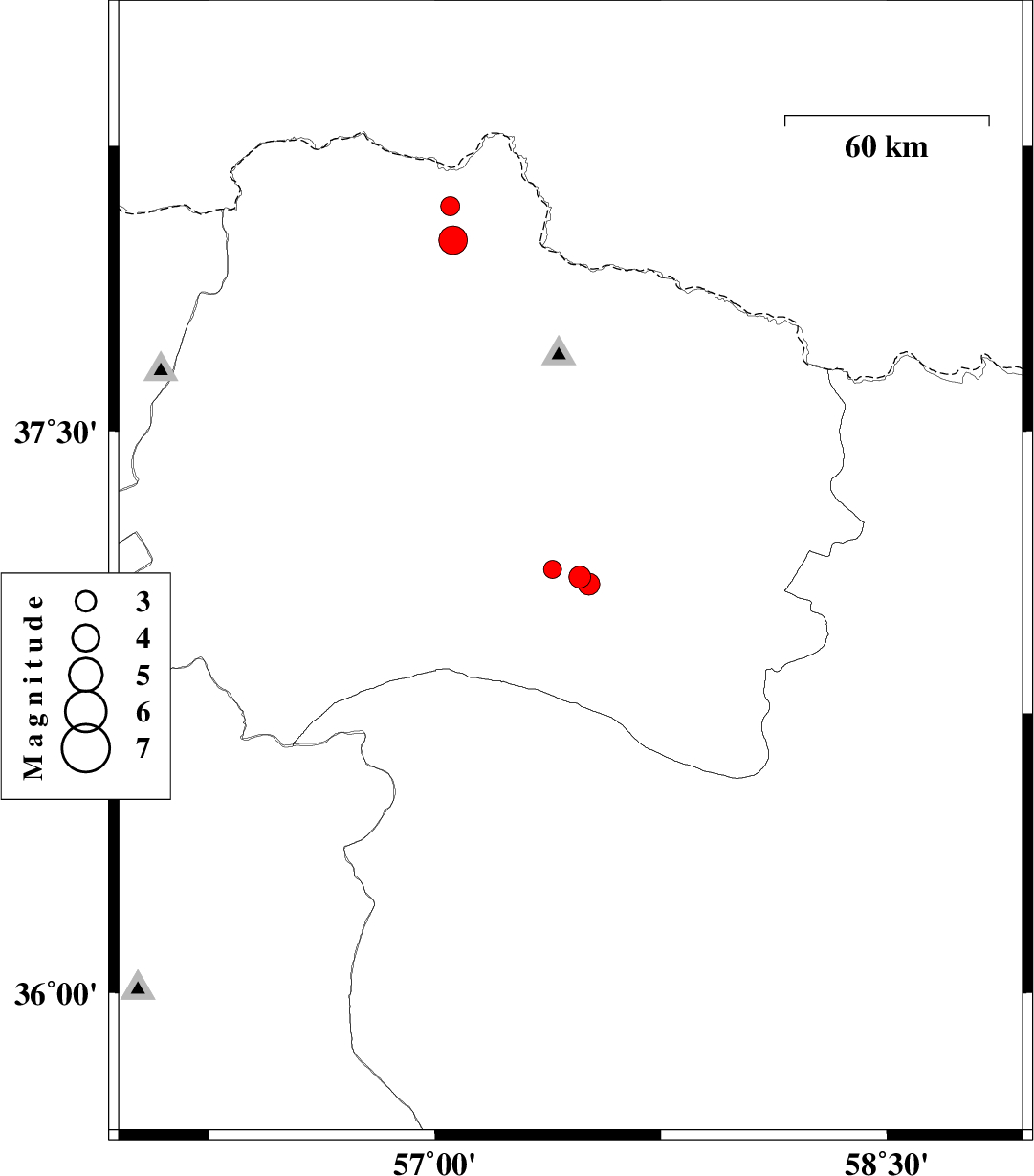 | 2011/12/08 | 17:06:55.7 | 20:36:55.7 | 37.22 | 57.44 | 34 | ML:2.8 | Khorasan(north) Province, 18 km North of Esfarayen | ||