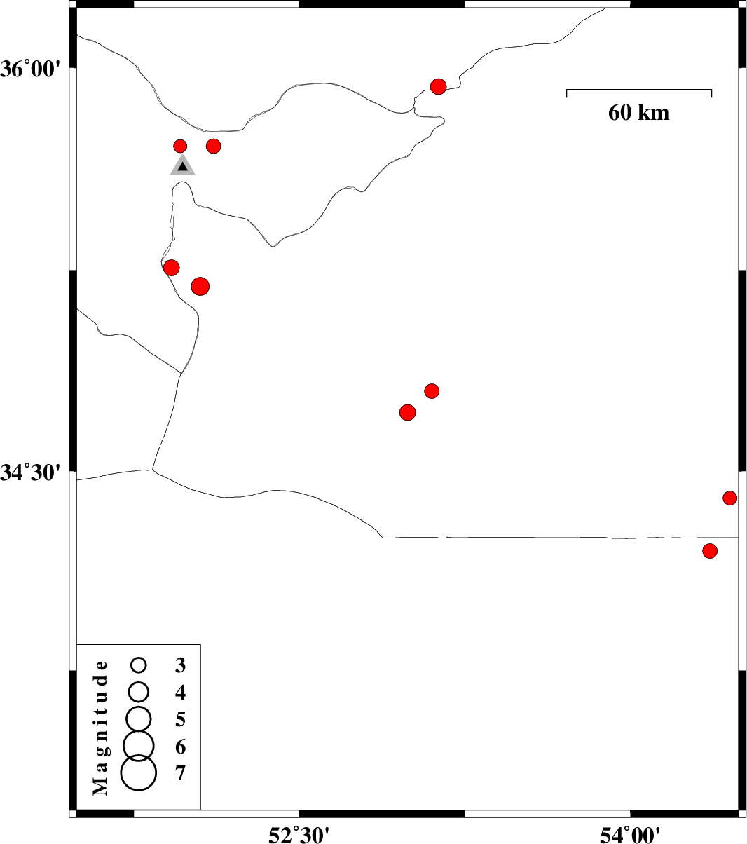 | 2011/11/17 | 08:10:17.5 | 11:40:17.5 | 34.4 | 54.45 | 46 | ML:2.8 | Semnan Province, 196 km South of Damghan |