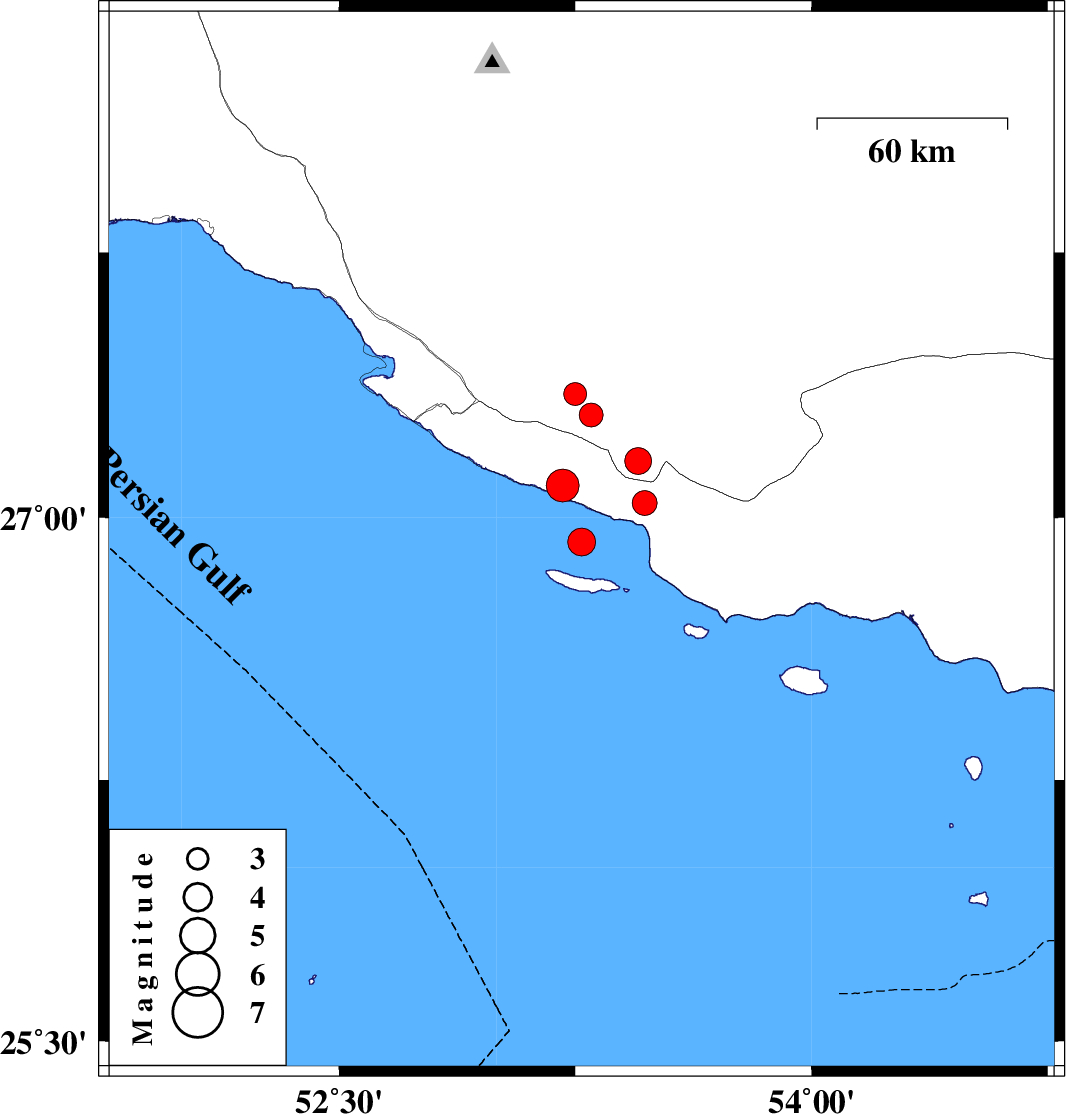 | 2011/12/09 | 08:46:32.1 | 12:16:32.1 | 26.93 | 53.27 | 16 | ML:3.9 | Persian Gulf, 46 km South-East of Lamerd | ||